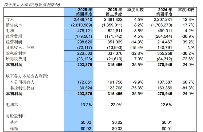 数据显示,2025年第四季度,中芯国际实现销售收入 24.89 亿美元,环比增长 4.5%,销售收入上升主要由于 2025 年第四季晶圆销量增加及产品组合变动所致。在此期间,公司毛利率为 19.2%,产能利用率保持在 95.7%。