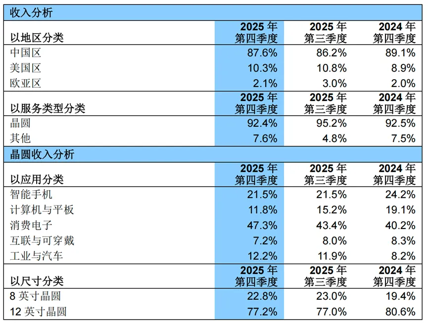 按照地区划分,如下图所示,中芯国际第四季度的营收有87%来自中国区;从应用上看,消费电子则是公司最大营收贡献来源,紧随其后的是智能手机、工业与汽车、计算机与平板以及互联与可穿戴。