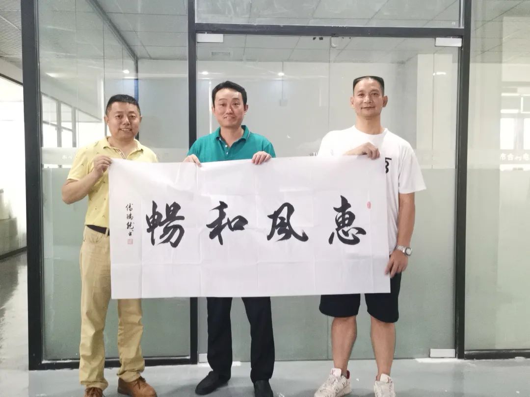 执行会长熊小军、常务副会长(深圳分会负责人戈志强)为曾锋期赠送《惠风和畅》书法横幅,祈望该公司风调雨顺,财源广进。