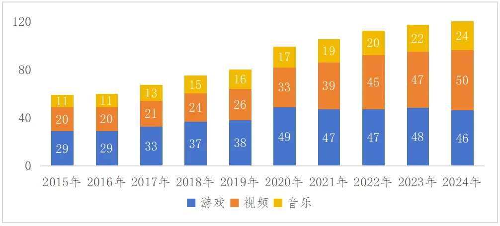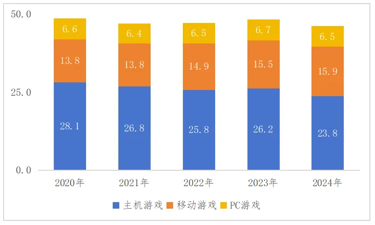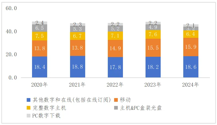 图4 2020—2024年英国游戏产业细分市场规模(单位/亿英镑)