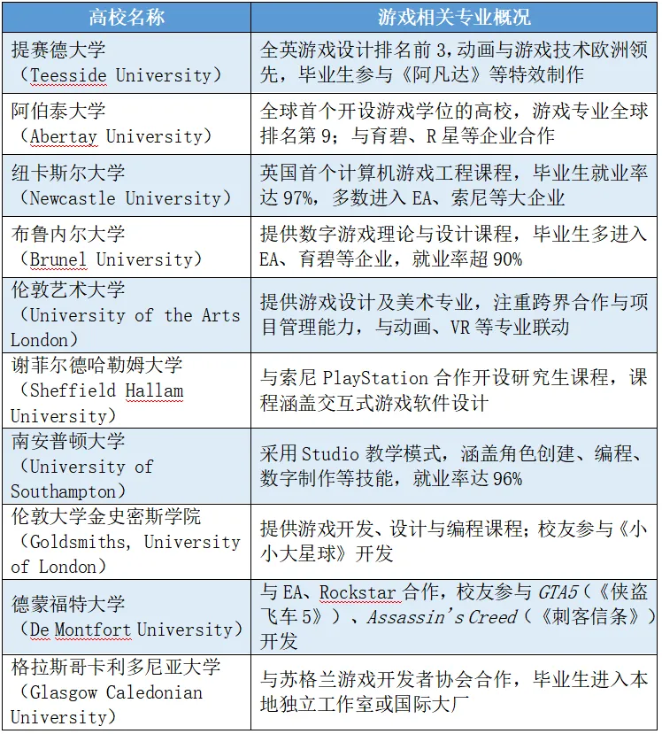 英国重视游戏人才培养,据统计,在英国累计有56所大学开设了游戏相关课程,每年约有31000名计算机专业(含游戏方向)大学毕业生,提供215种本科和40种研究生阶段的游戏专业课程供选择,主要课程包括游戏设计(如游戏策划、游戏玩法、规则、角色等设计)、游戏技术(如游戏编程、3D建模、VR/AR等)及游戏营销推广(市场营销、数据分析等)等,基本能涵盖行业所需岗位要求的技能,同时,为了迎合新技术和玩家的需求,学习的课程和技能也随之调整,近几年兴起的元宇宙、AI等新技术课程也陆续加入其中。