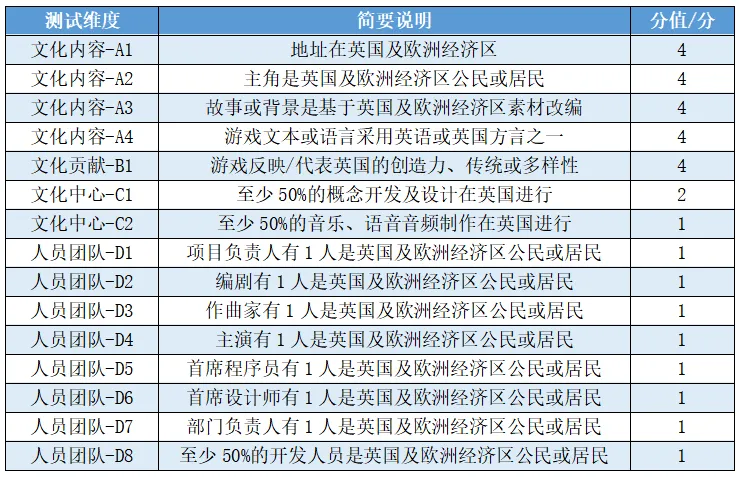 英国是全球率先对游戏等创意产业出台政策扶持的国家,从2014年开始,英国财政部每年都会为“具有英国文化”且符合审核条件的游戏公司提供税收减免(简称VGTR),需要由英国电影协会进行文化测试并颁发认证书,文化测试详情见表2所示。最高可减免总核心支出(指的是用于游戏设计、制作和测试成本)的20%,抵扣税率为25%,游戏公司可以从总核心成本的80%和在英国或者欧洲经济区(指的是欧盟、挪威、冰岛和列支敦士登)的全部核心支出,任选其中金额最高的进行抵税,并要求这些核心支出中至少有25%是在英国或者欧洲经济区消费,若是处于亏损状态的公司,可以按照最高25%税率退还,以扶持本土游戏公司发展,抵消他们在新游戏的设计、制作和测试上花费的资金,从而降低企业的游戏开发成本,值得注意的是,为广告目的而创建的游戏和博彩类游戏不在此范围内。官方数据显示,2014—2023年,累计有超过1940款游戏符合申请条件,英国政府已经在VGTR上支出了51亿英镑(约合477亿人民币),其中仅Rockstar Games一家公司累计退税就超过2亿英镑(约合18.7亿人民币)。
