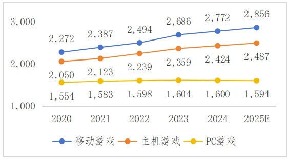 图6 2020—2025年英国游戏分平台用户规模(单位/万人)