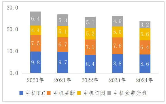 2024年,英国主机游戏市场规模(不含硬件)达到24亿英镑,整体来看英国主机游戏市场已进入成熟后期,依赖精品爆款驱动增长。从细分市场来看,仅有主机订阅付费在2024年保持正向增长,同比2023年增长12%至5.6亿英镑,主机DLC付费几乎与2023年持平,仍然稳居第1位,而主机买断付费同比2023年下滑15%,跌至6.4亿英镑。盒装光盘主机同比2023年减少35%,跌幅最大,实体销售的萎缩导致数字内容占比相比在持续扩大,其中更高性价比的订阅付费日渐受到主机玩家喜欢,成为主机市场增长主要动力。具体如图8所示。