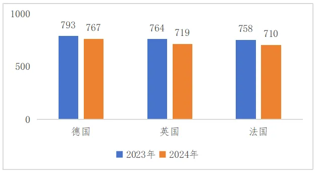 图11 2023—2024年英法德3国移动市场下载量(单位/百万次)