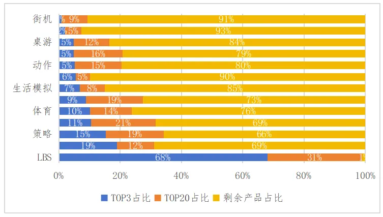 从品类集中度来看,英国的大多数品类头部集中度并不高,即使是策略、博彩及消除这三大收入主力品类也尚未出现一家独大局面,特别是消除类,前3名产品仅占据2%的市场份额,前20名产品也仅占5%。仅有LBS一个品类处于高集中度状态,前3名产品收入占比高达68%,这主要是由Pokémon GO这款现象级产品主导市场,剩余产品生存空间较窄。这表明英国市场各细分品类属于“群雄割据”状态,虽然竞品林立但均有一席之地,各细分赛道均有可尝试进入的市场空间。具体如图14所示。