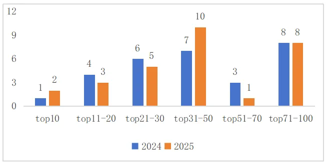 图17 2024—2025年英国前100名厂商中国厂商数量(分段位来看)