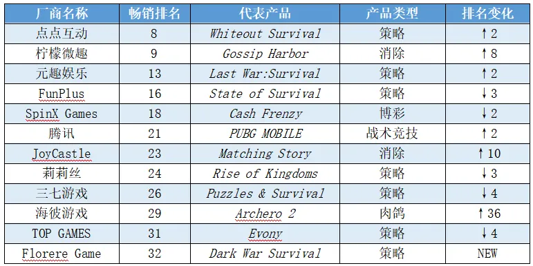 表32025年1—4月英国移动游戏畅销前100名厂商中前12的中国厂商代表及产品