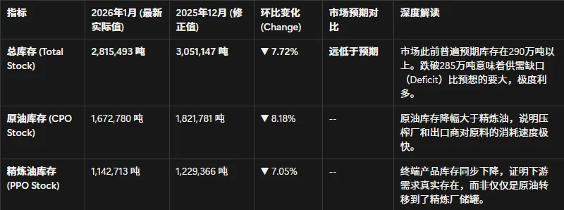 基于2026年2月10日发布的MPOB 1月官方数据,马来西亚市场的供需格局发生了根本性逆转。此前压制市场的“高库存”逻辑已被“强劲去库”的现实所取代。