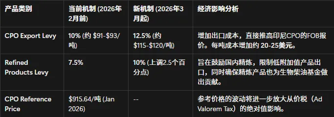 印尼计划从2026年3月1日起,将原棕油(CPO)的出口征税(Levy)从参考价格的 10% 上调至 12.5%。这一政策变动是Q1市场博弈的核心,旨在为B40/B50项目筹集更多补贴资金。