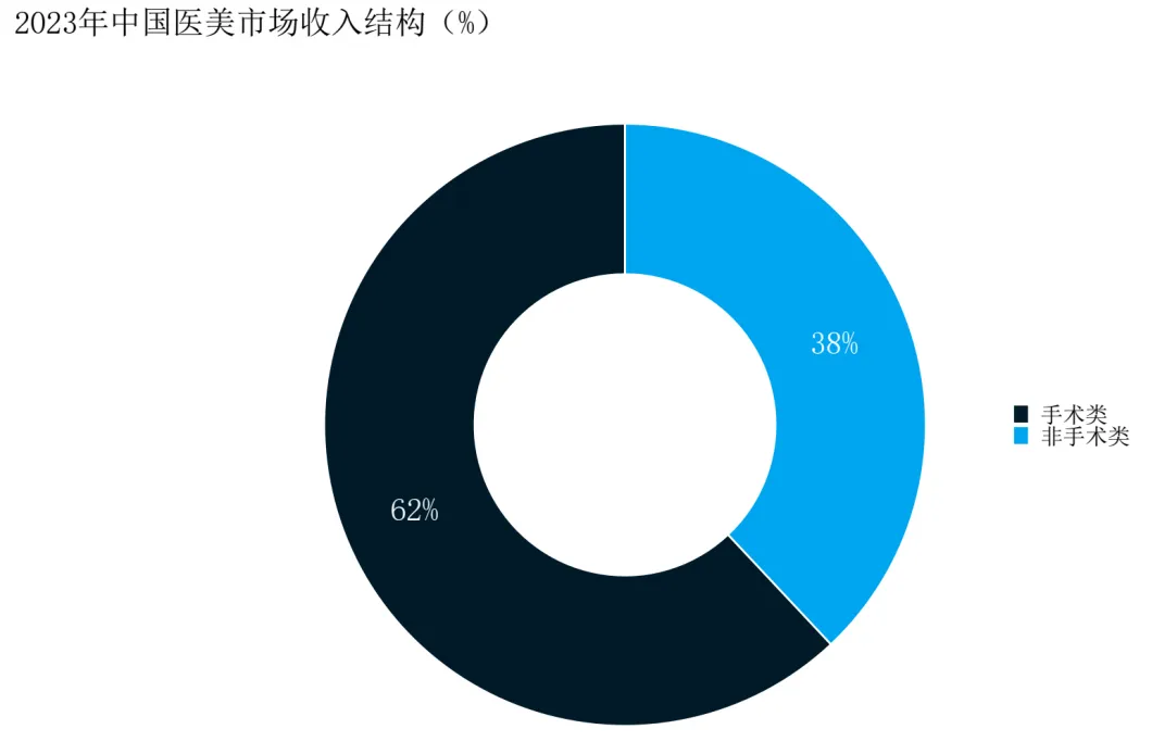 2023 年医美市场收入结构中,手术类项目仍以 62% 的占比占据主导,其效果持久但存在创伤大、恢复期长的特点;非手术类项目占比达 38%,凭借风险低、恢复快、消费门槛低的核心优势,成为行业扩容的核心抓手。
