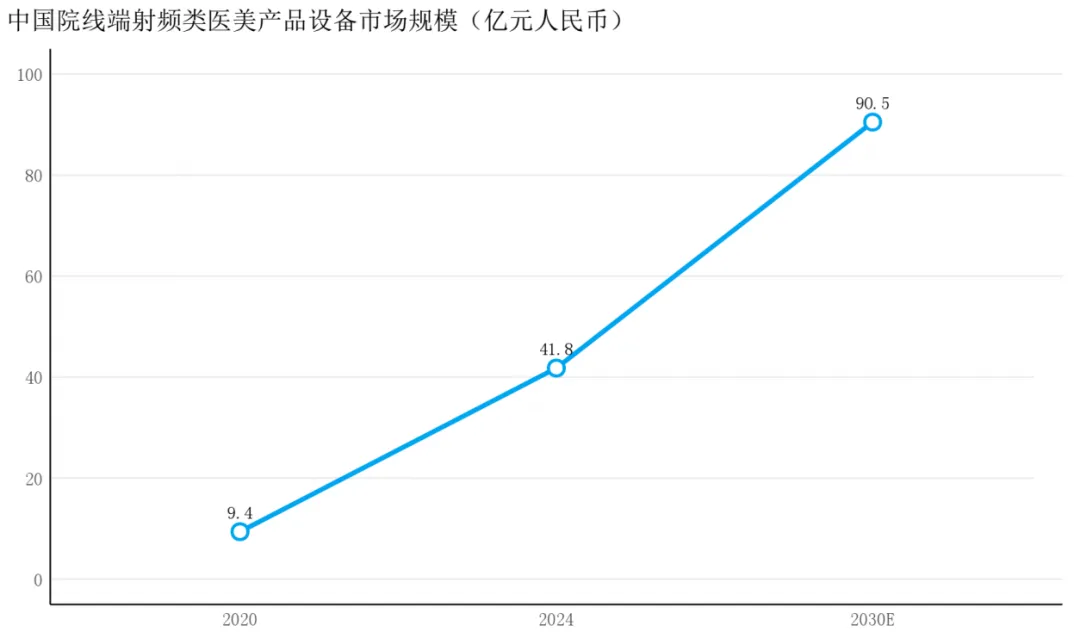 抗衰需求的刚性提升与技术创新,推动射频类医美项目爆发式增长。2020 年射频类医美设备市场规模仅 9.4 亿元,2024 年已快速增长至 41.8 亿元,四年时间增长超4倍,沙利文预测 2030 年该赛道规模将突破 90.5 亿元。