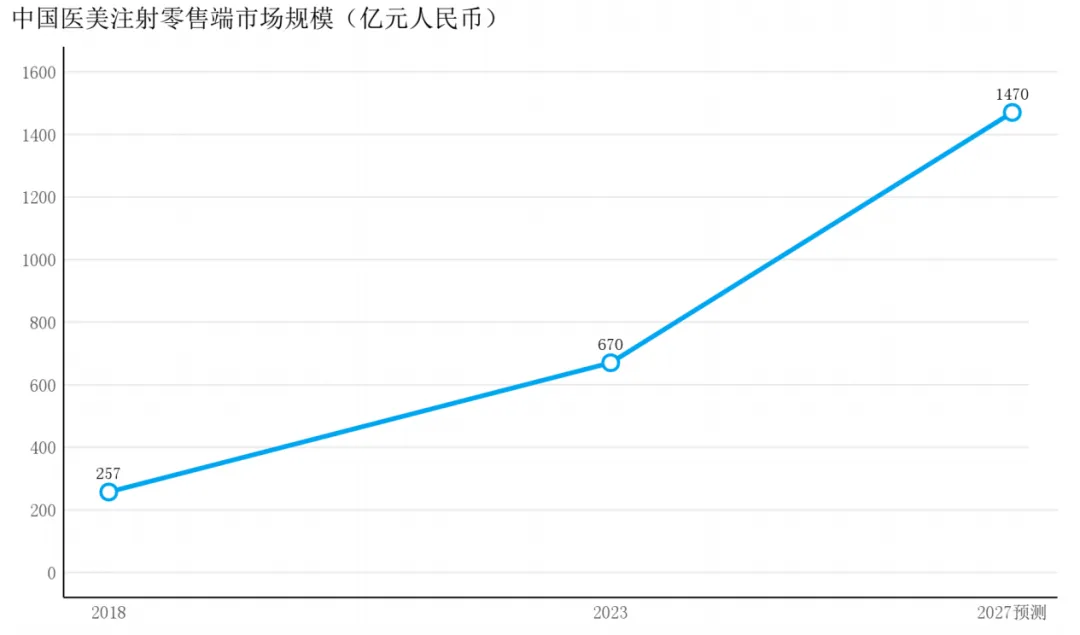 注射类是非手术医美赛道的核心板块,2023年市场规模达670亿元,较2018年的257亿元增长超两倍,沙利文预测2027年规模将达1470亿元。