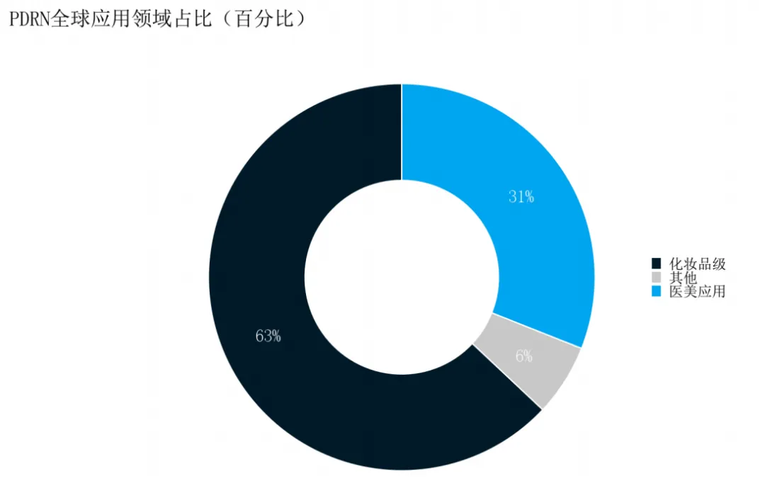 从全球应用分布来看,目前 PDRN 的化妆品级应用占比 63%,医美端应用仅占 31%,医美端仍有巨大的开发空间。