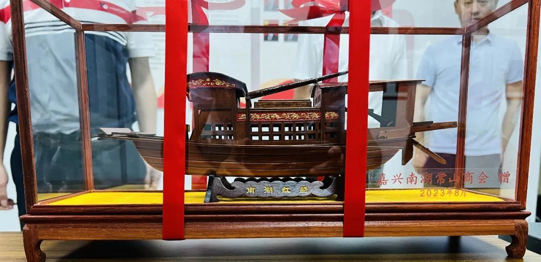 樊会长代表商会向常山县台州商会赠送南湖红船模型,这是双方友好情谊的长久见证,也将激励大家进一步传承“红船精神”。