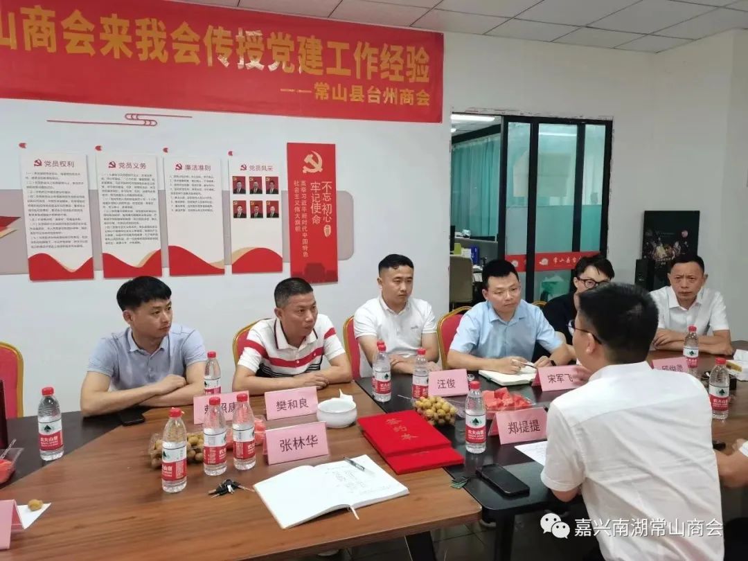 在交流中郑提提书记详细介绍了常山县台州商会流动党支部的建没情况,常山县台州商会陈伟民、陈海军和刘忠军3位副会长也一一作了交流发言。我会汪俊书记也介绍了南湖常山商会党建工作情况,对两地商会党支部结对共建充满期待。宋军飞常务副秘书长和赖照康、李凤君、何荣华、邱俊灵、洪琳等人也就工作交流了宝贵经验。