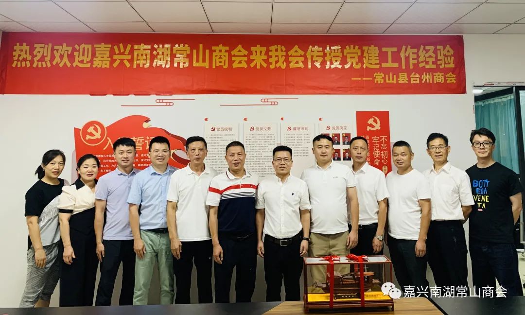 2023年8月18日下午,嘉兴南湖常山商会组织理事和优秀会员代表在樊和良会长的带队下,驱车前往台州市的常山县台州商会交流学习。嘉兴南湖常山商会会长樊和良、副会长兼党支部书记汪俊、理事邱俊灵、何荣华,党支部副书记赖照康,常务副秘书长宋军飞、李凤君,秘书处洪琳参加了此次交流活动。