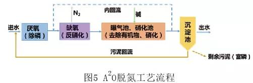 70年代,美国专家在A/O工艺的基础上,再加上除磷就成了A2O工艺(如图5)。我国1986年建厂的广州大坦沙污水处理厂,采用的就是A2O工艺,当时的设计处理水量为15万吨,是当时世界上最大的采用A2O工艺的污水处理厂。