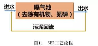 序批式活性污泥法(SBR)工艺是在时间上将厌氧段与好氧段进行分割。20 世纪70 年代初由美国Irvine公司开发。它在流程上只有一个基本单元,集调节池、曝气池和二沉池的功能于一池,进行水质水量调节、微生物降解有机物和固液分离等。经典 SBR 反应器的运行过程为:进水→曝气→沉淀→滗水→待机(如图11、 12)。