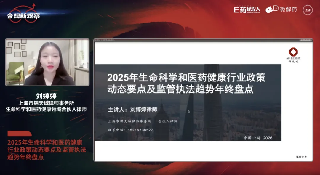 2026年1月21日,在E药经理人·微解药《合规新观察》“明天会更好·2026中国医药产业新年展望季”特别节目中,上海市锦天城律师事务所、生命科学和医药健康领域合伙人刘婷婷律师对2025年生命科学和医药健康行业的政策动态、监管执法趋势及产业发展进行了系统性回顾与前瞻。