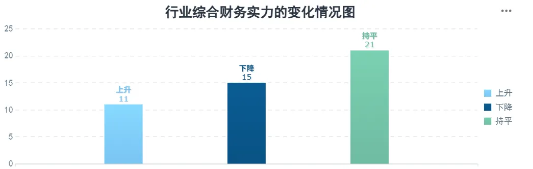 | 本行业综合财务实力变化情况是指行业内公司综合财务实力分数相较于过去一年中的同比变动幅度大于等于5%以上的情况, 其中变动分为上升和下降,此外变动浮动小于5%以内,定义为持平,反映了行业内不同受评主体综合财务实力变化的趋势。 |