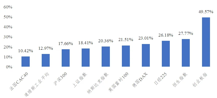 2025年全球主要股市均上涨,涨幅介于10%~30%之间,中国股市表现强势,创业板指数上涨近50%,涨幅位列全球主要股指第一,香港恒生指数上涨27.7%,涨幅位列第二。