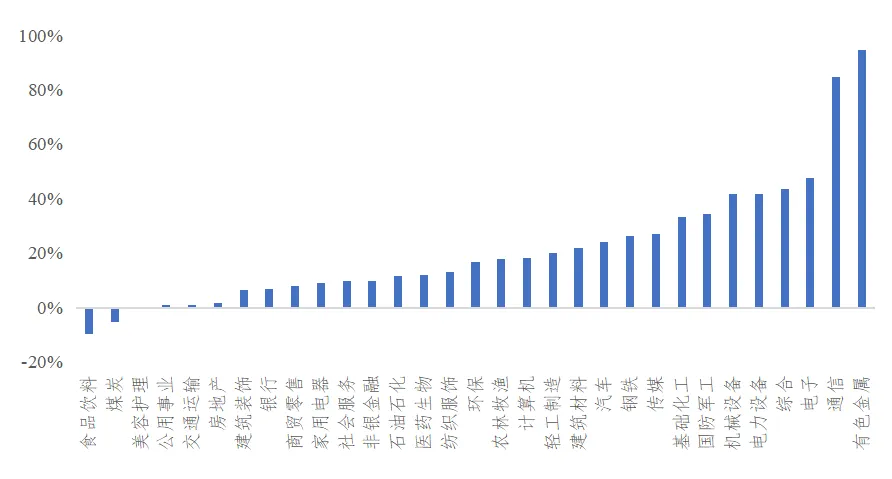 有色金属年度上涨幅度达到94%,通信行业指数上涨85%,电子行业指数上涨48%。