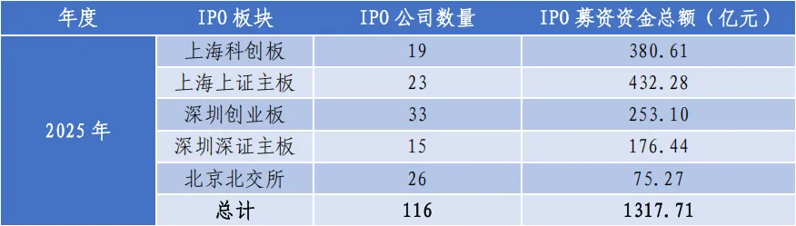 2025年度IPO数量为116家公司,比上年度增加了一成,但融资数量为1317亿元,比上年度增加了近一倍。在股市二级市场交易明显活跃的背景下,新股发行的节奏比2024年有所加快,但与2022年前后相比还是明显放缓。