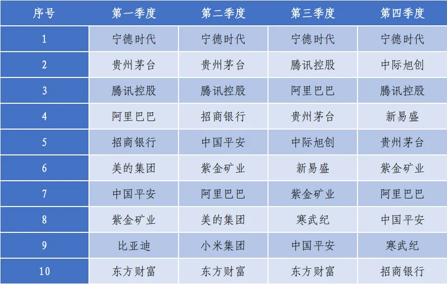 公募基金持仓市值最大的10只股票名单在2025年出现了一定变化。“宁德时代”在2024年第四季度成为公募基金第一重仓股之后,2025年连续四个季度稳居榜首。“贵州茅台”从第一名的位置持续滑落,第四季度已经降至第五位。“招商银行”和“中国平安”的位次也有所下移。从2024年开始,“中际旭创”和“新易盛”出现在基金的重仓股名单里,且排名位置在2025年逐季提升。“中际旭创”和“新易盛”的业绩快速爆发与人工智能产业发展直接相关。