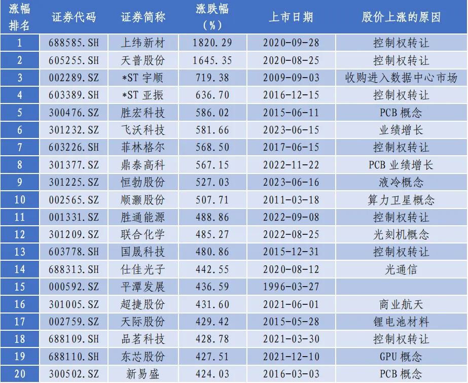 上市公司的并购重组成为市场资金追逐的热点,尤其是控制权转让类公司的股票位列涨幅榜前列。在涨幅前20的股票中,有7只属于控制权转让,这些股票的上市时间集中在2020年至2023年,正是注册制改革快速推进的阶段,这四年里新增上市公司近2000家,上市门槛较低,通过控制权转让是套现的最佳选择。另外,这些公司有共同的特点,经营业绩较差,上市公司之后一直徘徊在亏损的边缘。从控制权转让市场的需求方看,大多数属于“新质生产力”行业,涨幅最大的“上纬新材”的新任控股股东为“智元机器人”公司,而涨幅第二名的“天普股份”的控制权转让给了“中昊芯英”,该公司的主营产品是TPU、AI芯片,并且该团队有海外大公司的工作经历。