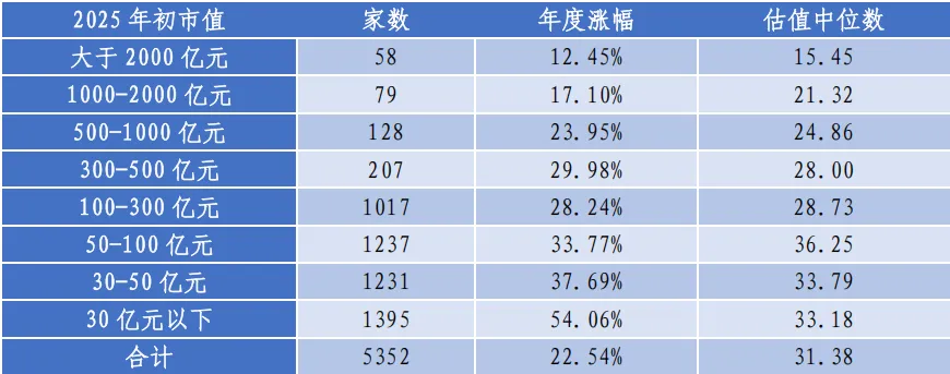 数据来源:Wind,2025年新上市的公司已剔除,按照2025年初市值规模分为9组。