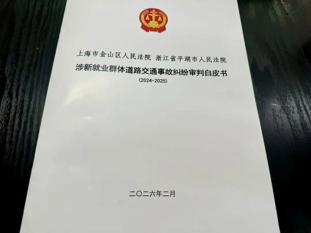 2月9日下午,上海市金山区人民法院与浙江省平湖市人民法院联合召开新闻发布会,发布《涉新就业群体道路交通事故纠纷审判白皮书(2024-2025)》。这标志着两地司法协作迈向更深层次,未来将持续保障新就业群体合法权益,为长三角更高质量一体化发展提供坚实的司法保障。