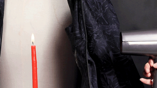 我们隔着这款外套用吹风机吹蜡烛,一点也吹不动;把衣服撤开,蜡烛瞬间被吹灭!