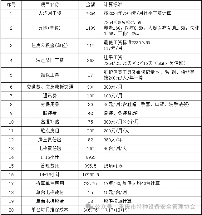 以上一项和二项相加为单个维保人员产生的实际人工成本,计10950.5元,按人均维保电(扶)梯数量40台计算,为每台每月273.76元。