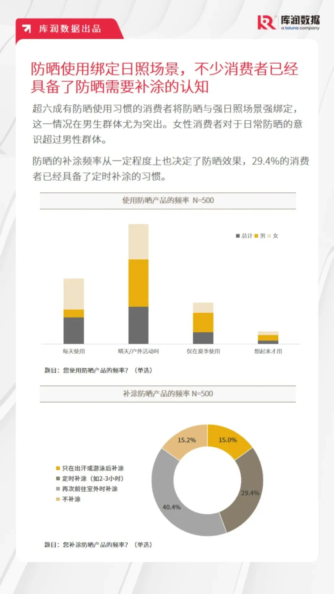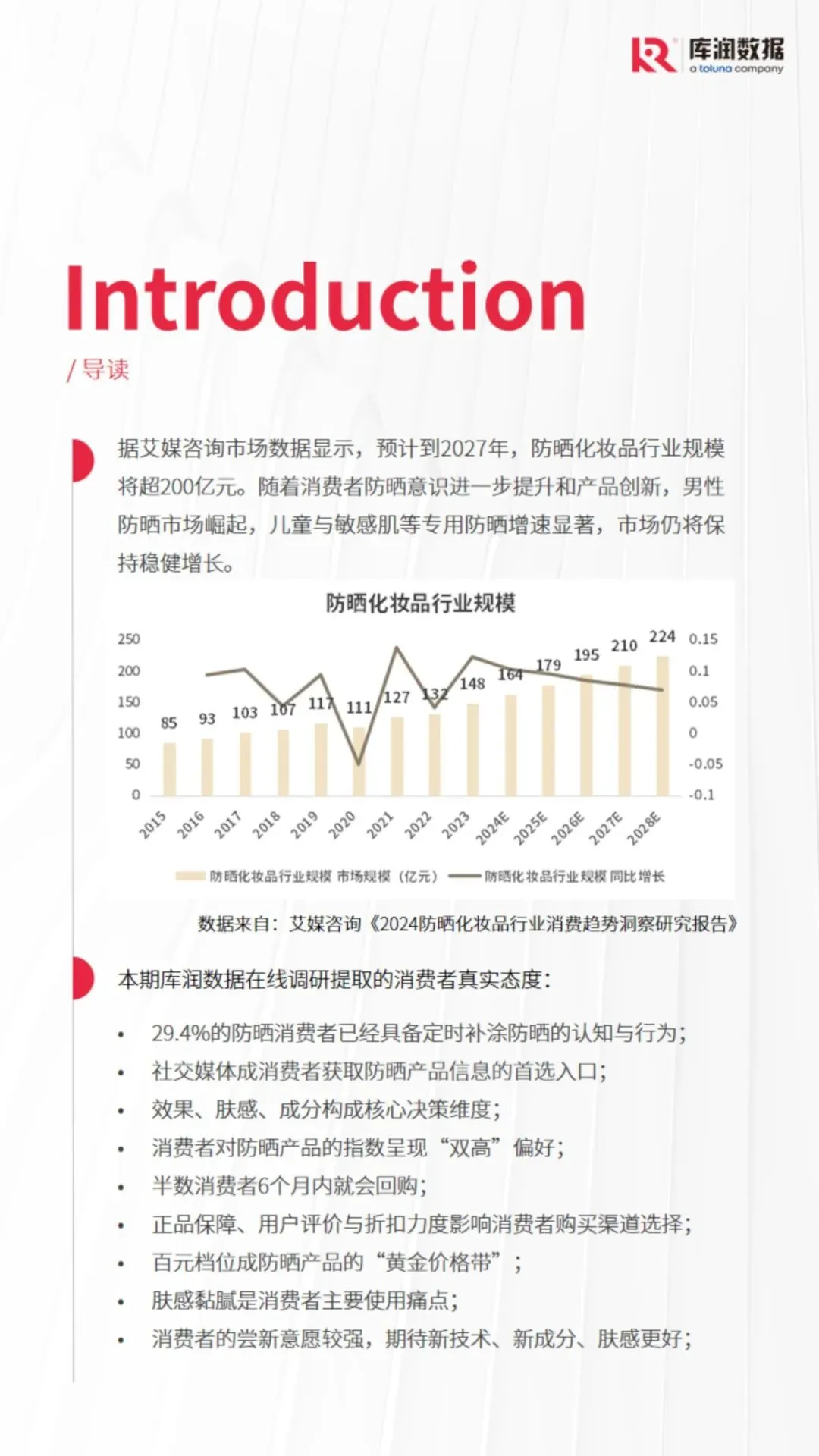 库润数据基于500份覆盖全国1-5线、有防晒使用习惯的消费者在线问卷,结合艾媒咨询行业数据,描绘2025年中国防晒化妆品“需求-决策-体验-趋势”全链路图景。核心结论:防晒已升级为全年刚需,高指数(SPF50+、PA+++)成标配,百元价格带占主流;效果、肤感、成分构成“黄金三角”决策框架,但黏腻痛点使仅10.2%用户确定回购,66.4%消费者愿意尝新,技术迭代与细分场景创新成为下一轮增长引擎。