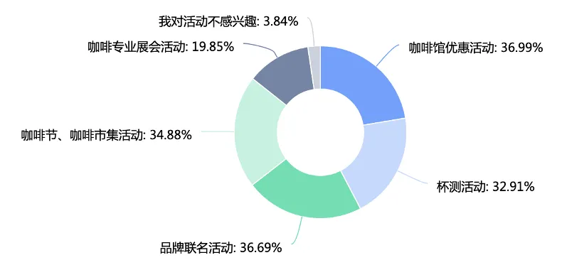 消费者对价格的敏感度提升,2025年受访者中54.11%会提前看好团购优惠再去消费,2024年此项占比为45.69%。消费者感兴趣的活动,咖啡节、咖啡市集保持了一定的比例外,品牌联名活动占比达到36.69%。