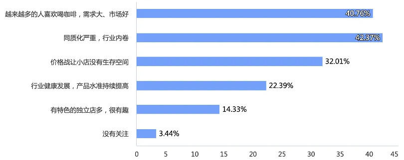 相对来说,咖啡消费者对成都咖啡市场的看法可谓两级分化。选择同质化严重、行业内卷的有42.32%,选择价格战让小店没有生存空间的有32.01%。