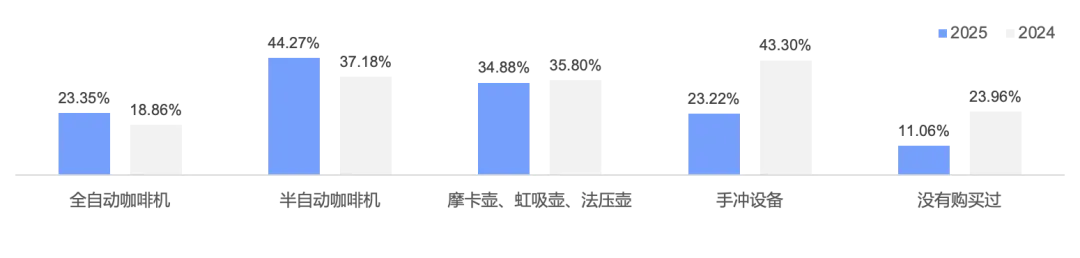 咖啡消费者中自己做咖啡的比例,相较于2024年有所提高。在购置的咖啡设备类型上,选择全自动咖啡机和半自动咖啡机的消费者比例均有所增加,而没有购买过咖啡设备的比例下降明显。
