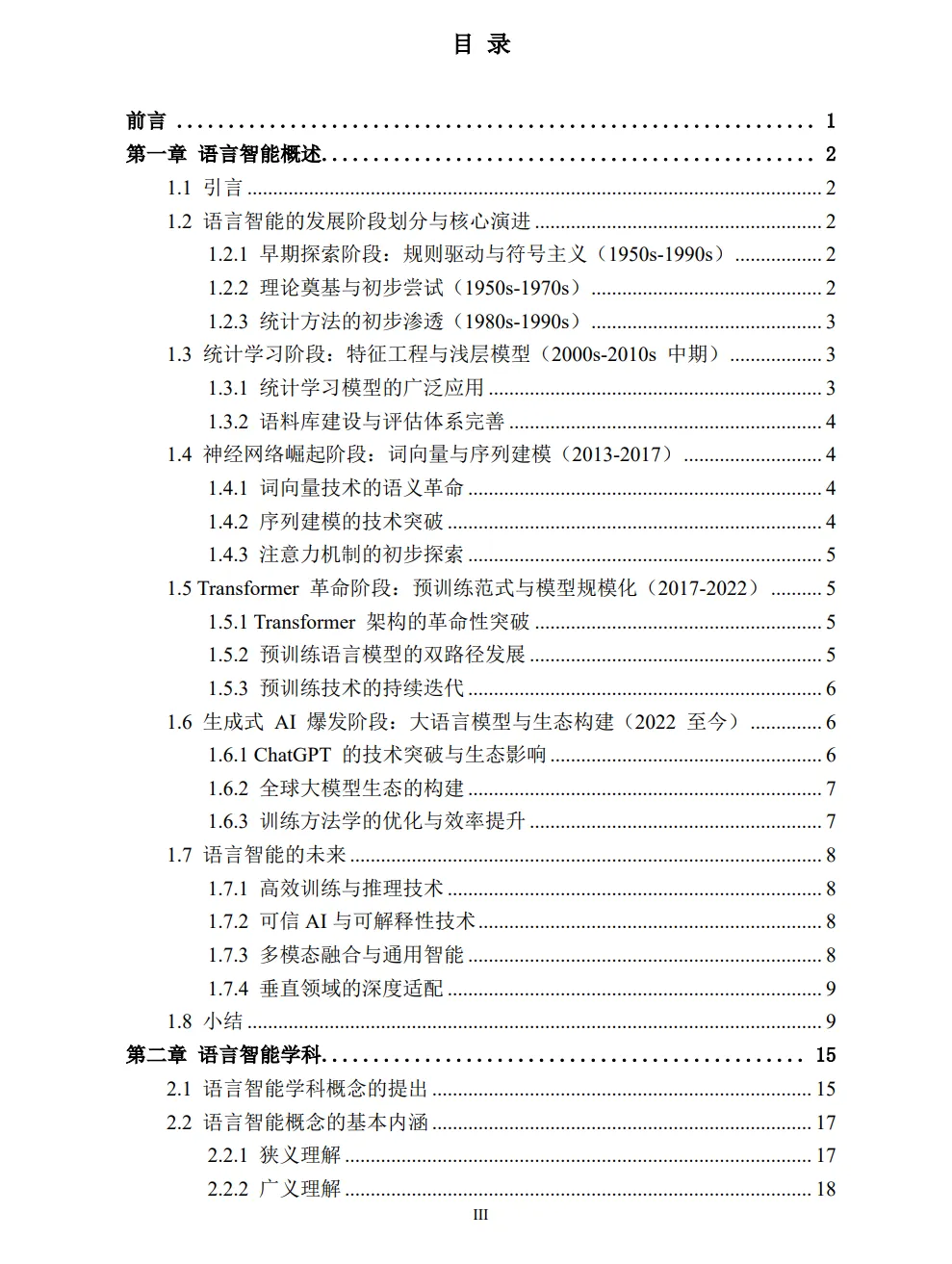 在人工智能与数字文明深度交融的时代背景下,语言智能作为人机协同的核 心驱动力,正以前所未有的速度重塑教育体系、跨文化交流、产业创新与社会治 理模式。为系统梳理该领域的技术演进、学科构建与应用生态,本白皮书汇聚产 学研多方智慧,围绕“技术-学科-应用”三维体系展开深度探索,深度解构其技 术攻坚路径、生态构建逻辑与治理挑战,旨在为技术探索者、政策设计者及产业 实践者提供前沿洞察与决策参考。 白皮书首先纵览语言智能发展轨迹,揭示其从规则驱动、统计学习到深度学 习的范式跃迁规律,勾勒出技术从感知理解向认知推理跃升的进化路线;进而奠 定学科根基,通过界定理论边界与时代必要性,构建“核心框架-技术体系-学科 关系”三维模型,并探索外语学科智能化转型的实践路径;最终聚焦技术内核, 围绕语言理解(机器的“读心术”)、语言生成(“创作力觉醒”)与语言交互 (人机“灵魂对话”)三大核心能力,将可信安全深度嵌入技术基因,确立“能 力越强,防护越密”的同步进化准则。 白皮书聚焦四大关键应用场景:教育智能通过作文批改的“篇章要素抽取→ 跨提示评分→可解释反馈”全链优化,及儿童语言评价的多维度框架,实现从结 果判定到过程干预的跃升;跨语言服务针对东南亚低资源语言(如老挝语),突 破语料与文化瓶颈,构建“神经机器翻译→知识增强→大模型优化”技术梯队; 社会治理依托负面情感分析攻克反讽识别与隐式情绪挖掘,筑牢公共安全与金融 风控决策基座;多模态关联以多模态知识图谱为枢纽驱动跨模态语义对齐及多跳 推理,助推工业质检、医疗诊断等场景智能升级。 白皮书通过“总结与展望”章节,勾勒出技术融合推动语言生成与大模型推 理协同进化,增强低资源场景适应性;学科建设深化外语教育与 AI 的嫁接,培 育跨领域人才;可信机制构建覆盖模态均衡性与文化偏见监测的动态防护体系; 最终以人本愿景实现“任意模态输入,统一语义理解”的可靠认知底座,驱动语 言智能服务人类文明包容性发展。 我们期望白皮书能够为语言智能领域的可持续发展提供策略建议,促进技术 创新,推动产业升级,为政策制定者提供学科建设与伦理治理参考,为技术开发 者厘清攻坚方向,为产业界锚定商业化路径,助力中国在全球语言智能浪潮中占 据创新制高点,并为构建智能社会贡献智慧和力量。专知便捷查看,访问下面网址或点击最底端“阅读原文”