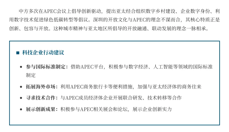 报告强调,APEC框架下的“数字经济路线图”和“包容性增长议程”将直接利好深圳的科技企业、跨境电商、供应链服务商及专业服务机构。尤其在人工智能、绿色能源、生物医药等领域,有望促成一批跨境联合研发与产业合作项目。