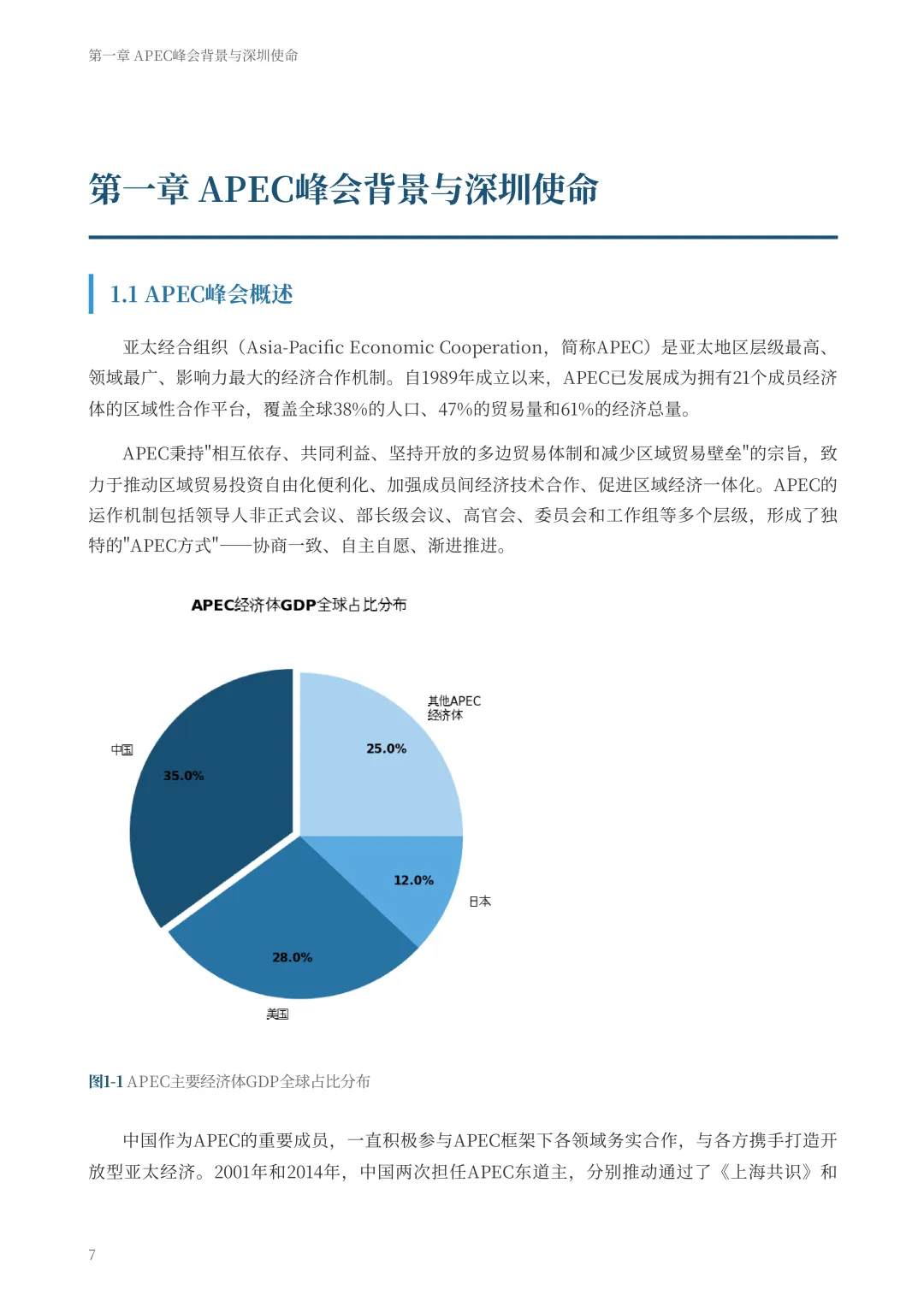 亚太经合组织(Asia-Pacifc Economic Cooperation,简称APEC)是亚太地区层级最高、领域最广、影响力最大的经济合作机制。自1989年成立以来,APEC已发展成为拥有21个成员经济体的区域性合作平台,覆盖全球38%的人口、47%的贸易量和61%的经济总量。
