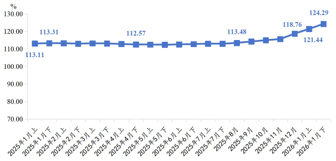 从细分板块来看,三类产品价格指数同步上行。其中,刃具价格指数运行水平最高,上下半月分别收于131.83点和134.24点,整体较2025年12月上涨5.10%;工具价格指数稳步上行,上下半月分别收于113.48点和117.67点,环比涨幅分别为2.03%和3.69%;对比之下,量具价格指数涨幅相对较小,上下半月分别收于117.62点和117.65点,整体较2025年12月上涨0.13%。