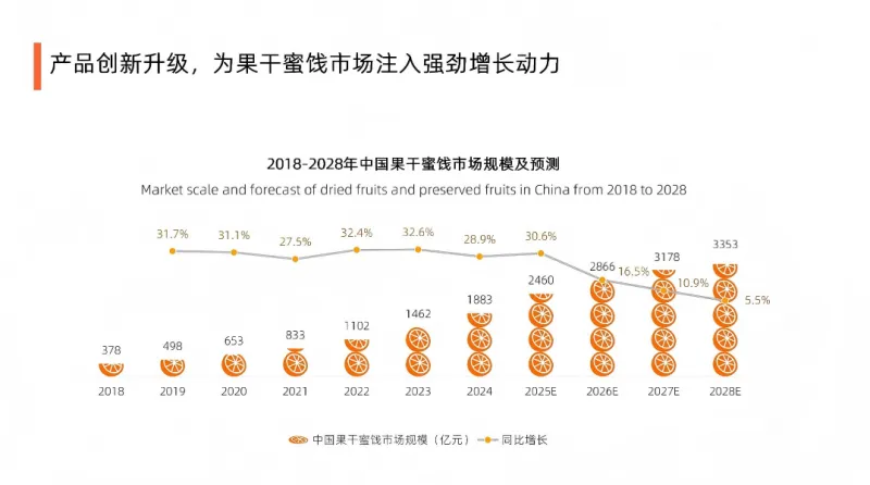 随着国民人均可支配收入稳步提升,消费者对休闲食品的品质要求持续攀升,果干蜜饯市场迎来更广阔的发展空间。艾媒咨询数据显示,2024年中国果干蜜饯市场规模达1883亿元,同比增长28.9%,预计2028年有望达到3353亿元。其中纯鲜果加工的果干细分赛道增速显著,艾媒咨询分析师认为,未来行业将朝着品质化、精细化的方向深度升级。