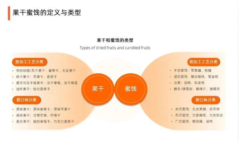 二、中国果干蜜饯市场发展现状分析 产品创新升级成为行业发展核心,2024年中国果干蜜饯市场规模达1883亿元,预计2028年增至3353亿元,行业从传统基础零食向“品质化、风味化、便捷化”的现代休闲食品转型,纯鲜果加工的果干成为驱动市场增长的核心引擎; 行业正从“单一化”向“品质化、多元化”升级,企业通过工艺革新提升产品口感与品质,同时丰富产品形态、拓展应用场景,推动产品从传统休闲零食向多场景适配的品质零食转型。