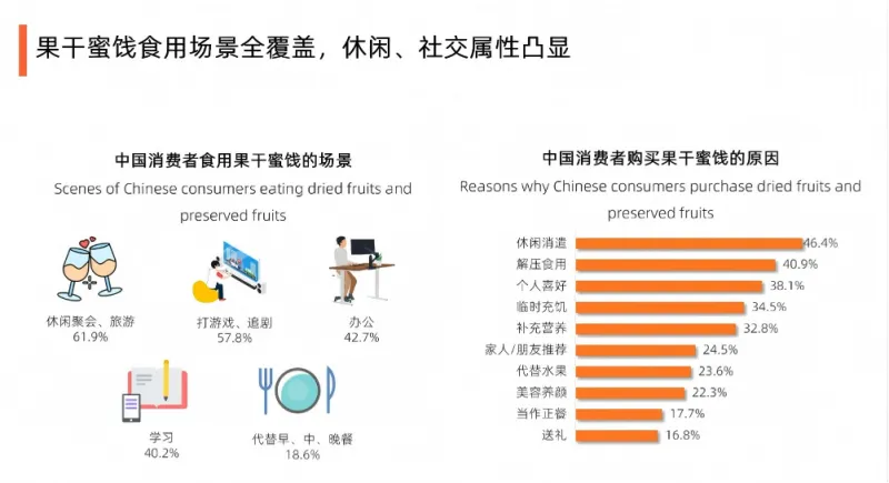 三、中国果干蜜饯类产品消费者洞察分析 果干蜜饯的消费场景实现全面覆盖,艾媒咨询数据显示,休闲聚会、旅游(61.9%)是核心消费场景,休闲消遣(46.4%)为主要购买原因,同时消费场景向办公加餐、亲子分享、户外补给等领域持续拓展,消费者对果干的便捷性、口感稳定性提出了更高要求。