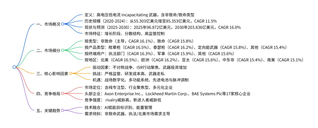 2025-2030 年全球电子武器市场呈现加速增长态势,2025 年市场规模达 96.872 亿美元,预计 2030 年将增至 203.836 亿美元,CAGR 为 16.0%,增量增长 106.964 亿美元;市场以非致命性武器(2025 年占比 93.1%)、眩晕枪(2025 年占比 33.4%)为主要产品类型,执法部门(2025 年占比 45.4%)为核心终端用户,北美地区(2025 年占比 36.4%)是最大且增长最快的区域市场;驱动因素包括不对称战争加剧、ISR 行动重视及武器投资增加,面临严格监管、研发成本高企等挑战,AI 融合与战场数字化为主要机遇,市场竞争格局分散,头部企业包括 Axon Enterprise Inc.、Lockheed Martin Corp. 等。
