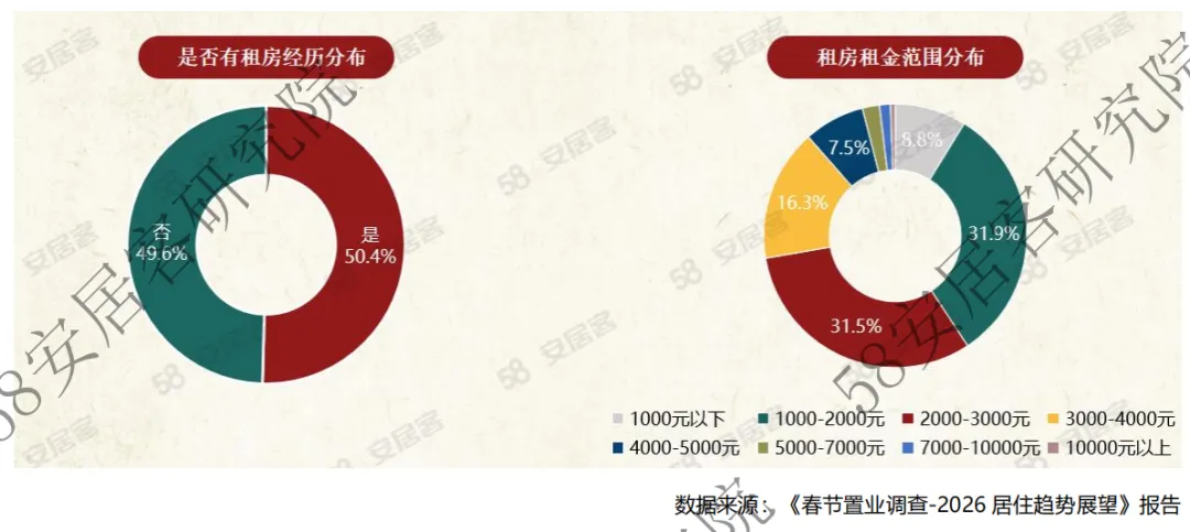 作为补充,一般住宅合租(18.5%)与长租公寓单间(11.7%)合计占比30.2%,成为性价比型或过渡型居住的重要选项。而长租公寓/行政公寓、单位宿舍等其他类型占比均低于6%,商铺、办公楼等非住宅类租房占比仅1.5%,需求占比极少。