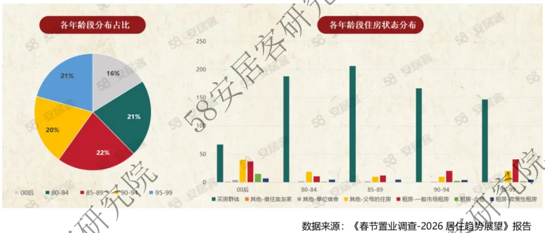 2、人群结构:代际差异显著,00后以“租房+家庭支持”为主,超30%选择租房