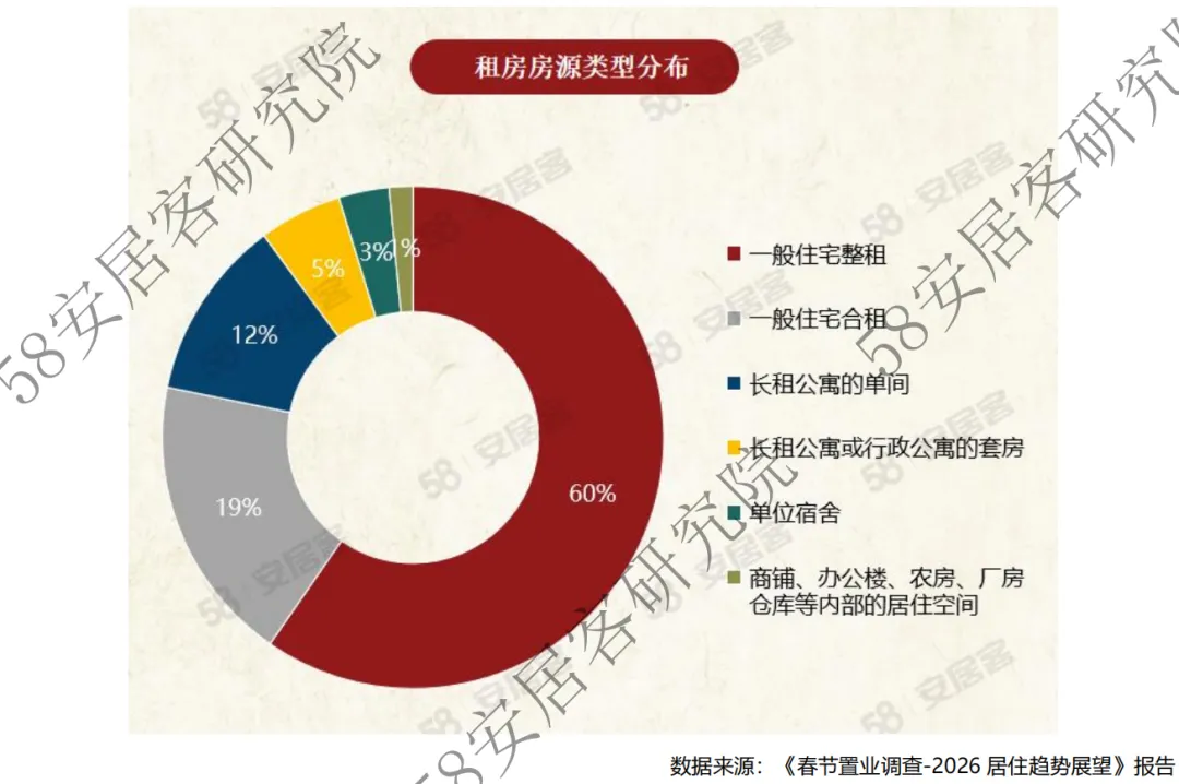 根据调研数据显示,租房群体在房源选择上高度聚焦于传统住宅类,呈现出“整租主导、合租与长租公寓补充”的特点。其中,一般住宅整租占比达59.7%,是绝对的主流选择,这反映出独立居住需求占据突出地位。