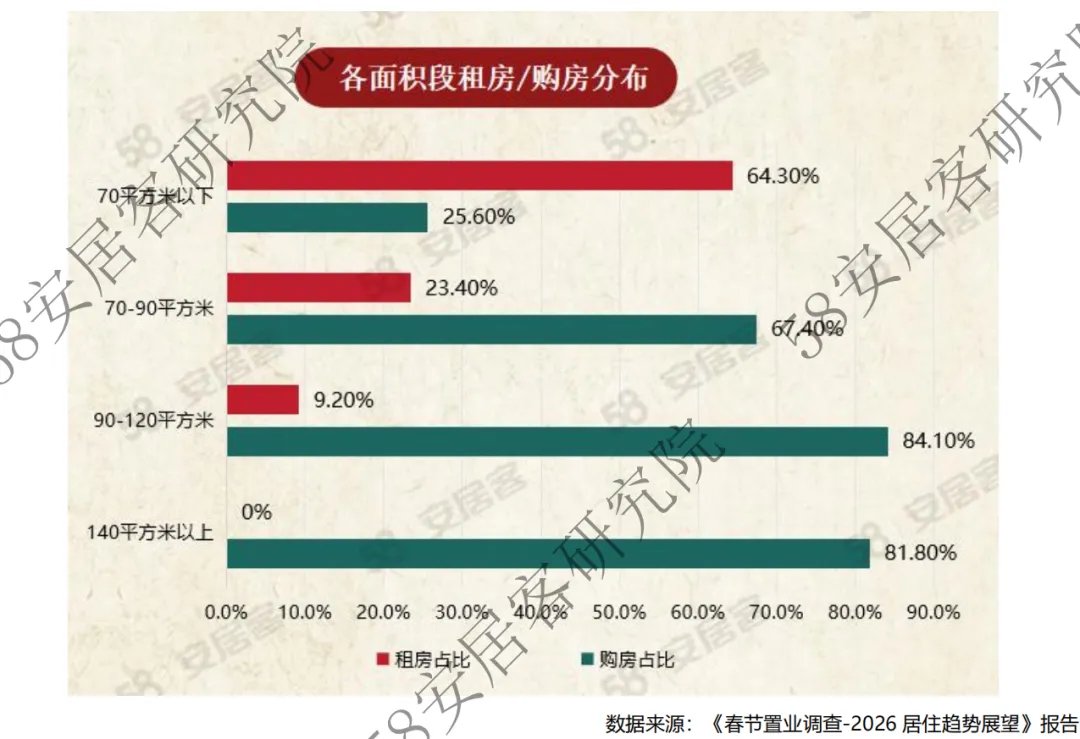 不同面积段的租购占比呈现出明显的梯度差异,反应出从“过渡性居住”到“自主性住房”的完整路径。
